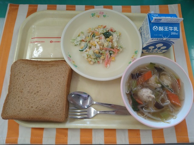 今日の献立は「黒糖食パン、スライスチーズ、牛乳、ひき肉団子のスープ、コールスローサラダ」です。黒糖は、サトウキビの絞り汁を煮詰めて作ります。カルシウムや鉄などのミネラルが含まれているため、渋みや苦味があり、独特で味わい深い甘味料として料理やお菓子作りに利用されます。日本では、沖縄県や鹿児島県で生産されています。