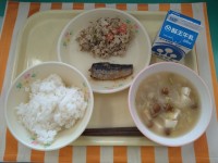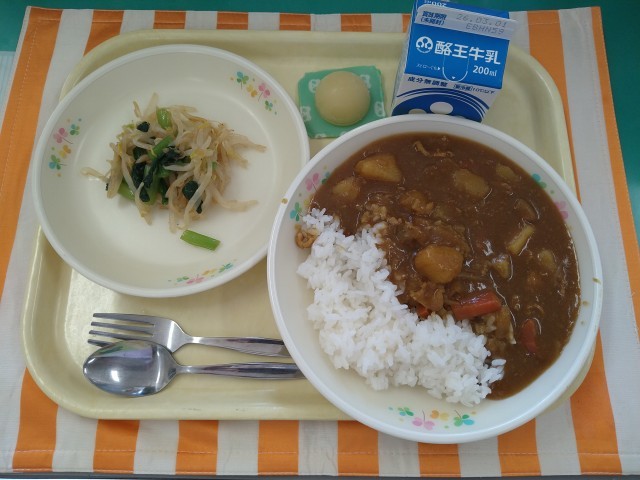 今日の献立は「ポークカレーライス、牛乳、もやしと小松菜の香味和え、りんごゼリー」です。今日は「SDGs献立」です。給食を通して、食品ロスや生ごみの削減などについて考え、「持続可能な社会の実現」に貢献したいと思います。カレーのにんじんには皮がついています。にんじんの皮を捨てずに食べることで生ごみの削減を目指しています。家庭でも、取り組んでみましょう。