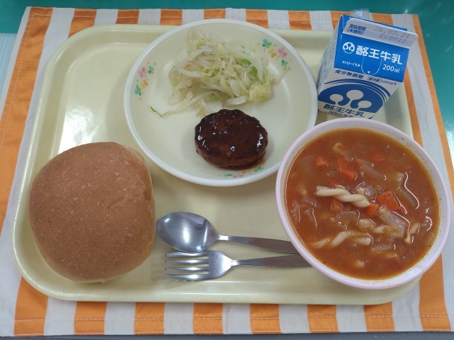 今日の献立は「バンズパン、牛乳、ハンバーグ、ボイル野菜、ミネストローネ」です。パスタの袋を見てみると、原材料名表示に「デュラムセモリナ」とあります。イタリア語で「デュラム」は小麦の種類、「セモリナ」とは粗挽き粉のことを指します。パスタの原料として有名で、パンやうどんに使われる小麦よりかたく、黄色の色味が強い特徴があります。