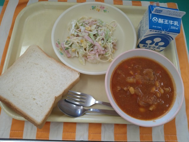 今日の献立は「食パン、牛乳、豚肉と大豆のケチャップ煮、スパゲッティサラダ」です。日本では、焼き型に蓋をして焼くので、四角い食パンが一般的ですが、イギリスでは、焼き型に蓋をせずに焼くため、上の部分が盛り上がって山の形をした食パンが主流です。世界には、その国を代表する様々なパンがあります。