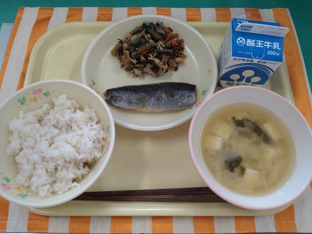 今日の献立は「麦ごはん、牛乳、にしんの塩焼き、ひじきの炒め煮、じゃがいもと小松菜のみそ汁」です。今日は「食育の日献立」です。和食は、野菜をたくさん食べることができて、たんぱく質、脂質、炭水化物といった栄養素のバランスも優れています。豆、ごま、海藻、野菜、魚、きのこ、いもなどの食品をすすんで取り入れ、家庭でも和食をどんどん食べるようにしましょう。