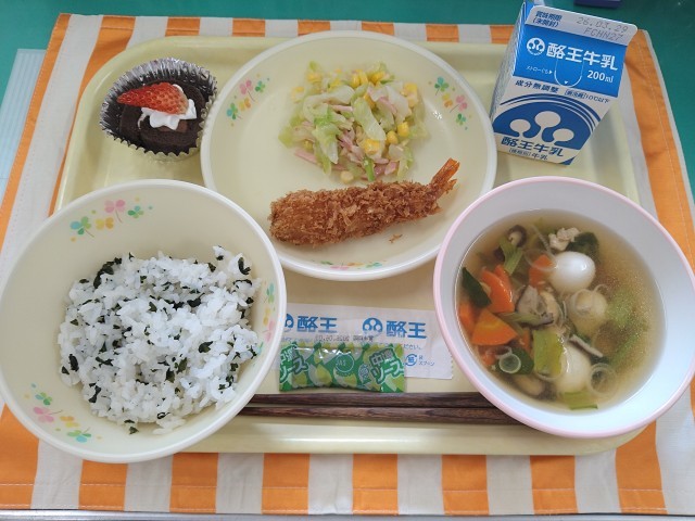 今日の献立は「わかめごはん、牛乳、えびフライ(パックソース)、コーンサラダ、うずらたまごのスープ、チョコロールケーキ」です。今日は「卒業お祝い献立」です。今年度最後の給食です。一年間の給食はどうでしたか?苦手なものが食べられるようになりましたか?好きなものや苦手なもの、いろいろな献立が登場したと思います。小学校での楽しい思い出の一つとして友達同士で振り返ってみてください。