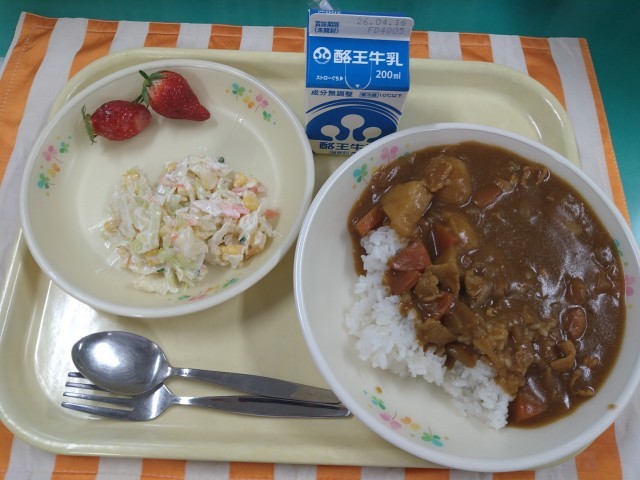 今日の献立は「ポークカレーライス、牛乳、コールスローサラダ、いちご」です。今日から給食が始まりました。給食で初めて食べるものが出てくることもあると思いますが、食べず嫌いにならないように、まずはひとくち食べてみましょう。食べてみたらおいしかった!となることもあります。「苦手なものでも、まずはひと口」を合言葉にチャレンジしていきましょう。