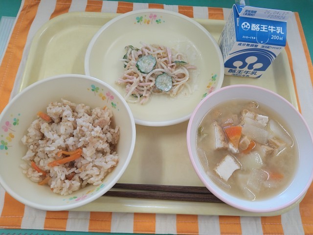 今日の献立は「ツナごはん、牛乳、マロニーサラダ、根菜汁」です。毎月8日 は「こおりやまお米の日」です。郡山市は猪苗代湖の豊富な水を引き込んだ“安積疎水”により、豊かな水田が広がる日本有数の米どころです。年々、お米を食べる日本人が少なくなっています。日本の食文化を守り、伝えていくために、進んでお米を食べましょう。