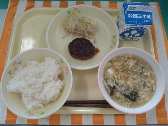 今日の献立は「ごはん、牛乳、ハンバーグ、キャベツともやしの黒こしょうサラダ、たまごスープ」です。たまごには、殻が白いものと赤いものがありますが、どちらも栄養素に違いはありません。また、たまごの黄身の色が濃い方が、栄養素がたくさんあると思われていますが、色が薄くても濃くても栄養素に差はありません。たまごの色は、親のニワトリが食べるえさによってかわります。