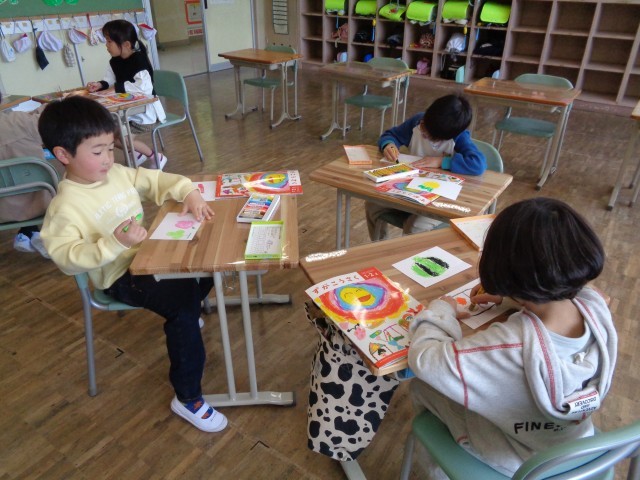 すきな食べ物や動物を楽しそうにクレヨンで描きました。最後に、色とりどりのお日さまを描いて、みんなで発表することができました。
