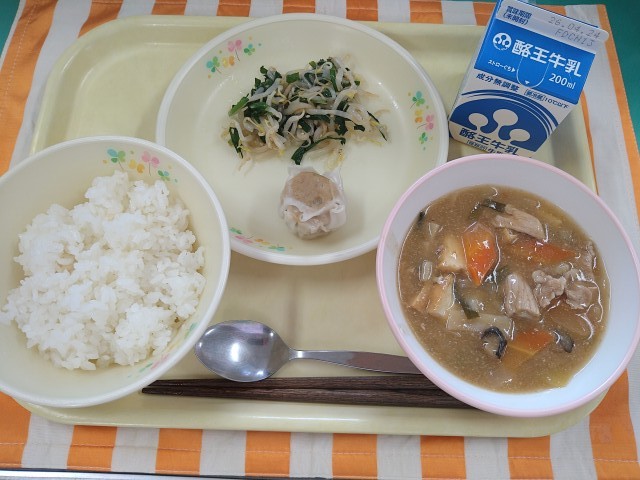 今日の献立は「ごはん、牛乳、ジャジャン豆腐、肉焼売、もやしとにらのナムル」です。ジャジャン豆腐とは、生揚げをみそで炒めた料理です。中国では麻婆豆腐とならんで、よく知られている四川料理のひとつです。「ジャジャン」は、中国語で、「家庭風」という意味だそうです。ごはんと合わせて、モリモリ食べましょう。