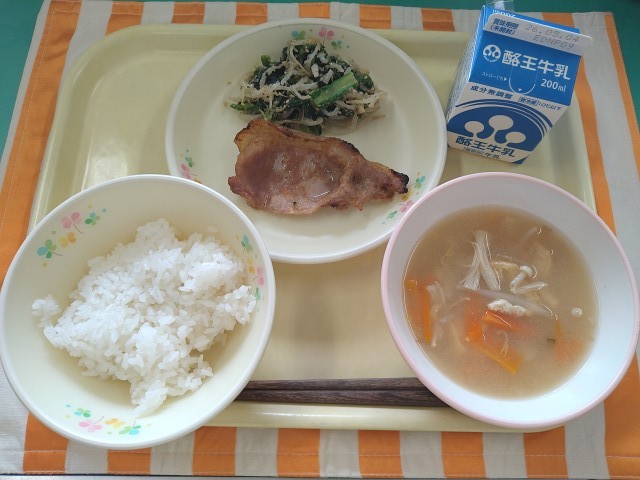 今日の献立は「ごはん、牛乳、豚肉の生姜焼き、青菜ともやしのごま和え、にんじんとえのきたけのみそ汁」です。豚肉の生姜焼きは、忙しい飲食店でも素早くできるスタミナ料理として定番となりました。時間がかかる「とんかつ」に代わり、短い時間で調理できるメニューとして考え出されました。豚肉を醤油ダレにからめて焼いたのが始まりです。
