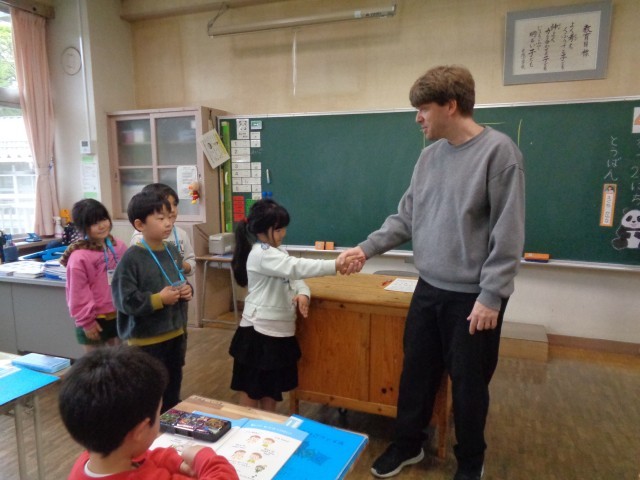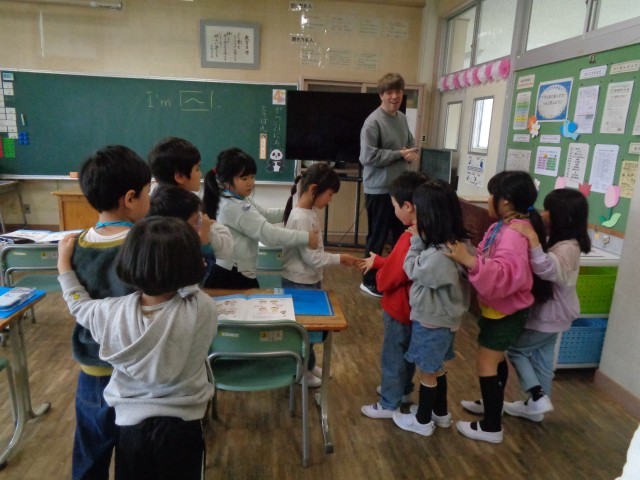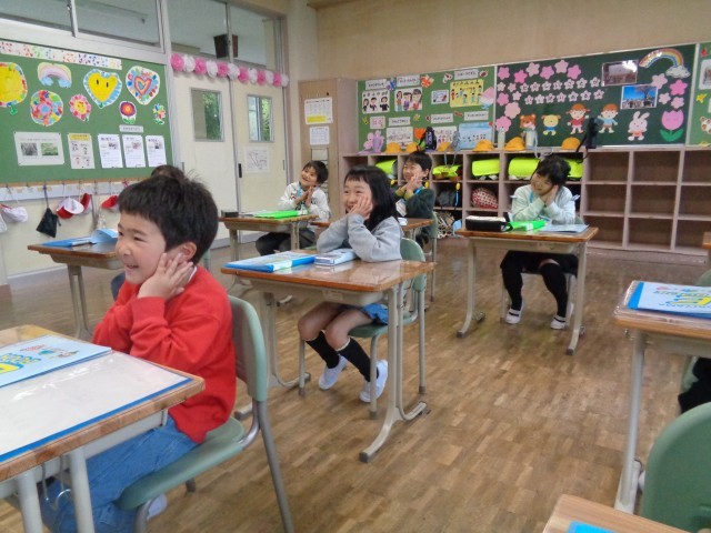 1年生にとっては、初めての英語の学習です。ブラットリー先生のジェスチャーも面白くて、みんなの顔が笑顔でいっぱいになりました。「えいごっておもしろーい!」と次の英語の授業を楽しみにしている子どもたちでした。