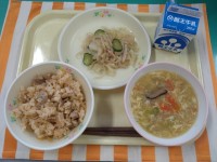 暑さが一段落した今日の給食は、ハヤシライス、キャベツサラダ、牛乳です。