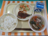 今日の給食は、海老根小さんの2・3・4年生リクエスト献立の、ココア揚げパン、コーンサラダ、わかめ卵スープ、富士山ゼリー、牛乳です。