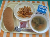 今日の献立は「コッペパン、いちごジャム、牛乳、ペンネミートソース、野菜スープ」で...