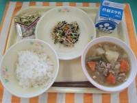 今日の献立は「ごはん、牛乳、肉じゃが、ひじきの五色和え、ビーンズカル」です。肉じ...