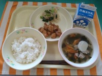 今日の献立は「ごはん、牛乳、タッチョリム、チンゲンサイのナムル、トック入りわかめ...