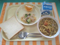 今日の献立は「食パン、牛乳、マカロニのカレー煮、ブロッコリーサラダ、デコポン」で...