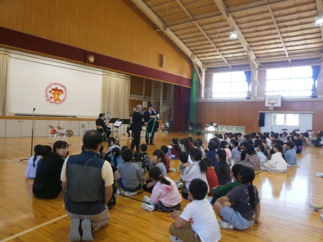 全校生が体育館に集まり、管弦楽によるプロのみなさんの演奏を聞くことができました。