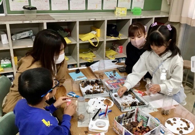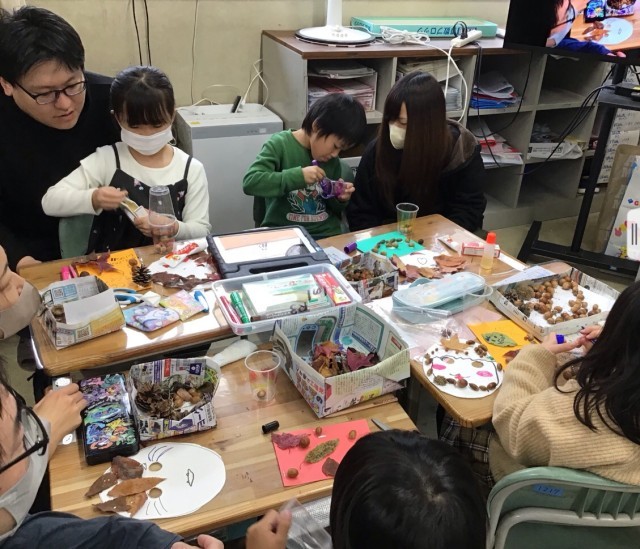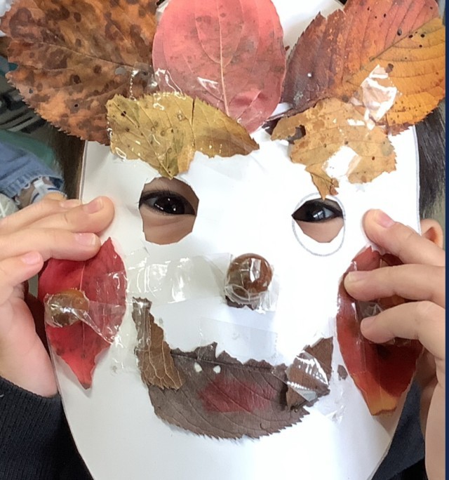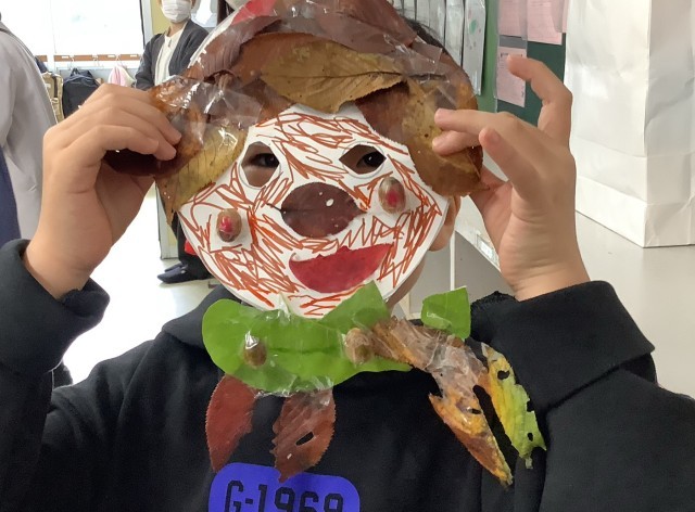 1年生 土曜参観は、秋の葉や木の実を使って、お面やマラカスを作りました。