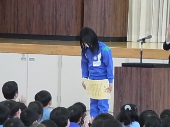 全校集会が行われました。まずは,表彰がありました。6年生は,全校の代表として校長先生から賞状をいただきました。
