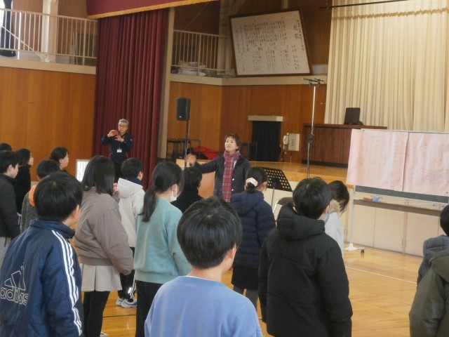 2月16日(月)に体育館において、3校時は6年生、4校時は5年生に対して、講師の先生による合唱指導が行われました。