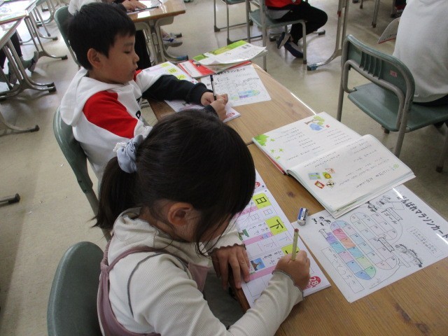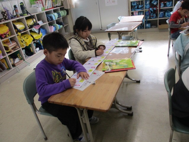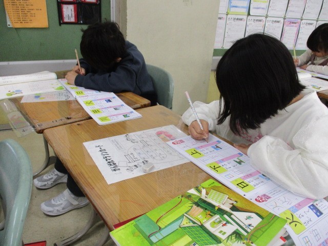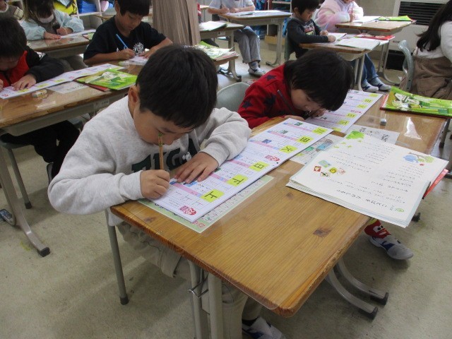1年生 国語。漢字の学習では筆順を大切にしています。数を唱えながら何度も書く練習をしていました。