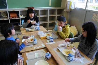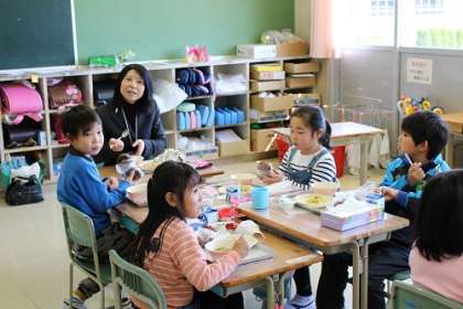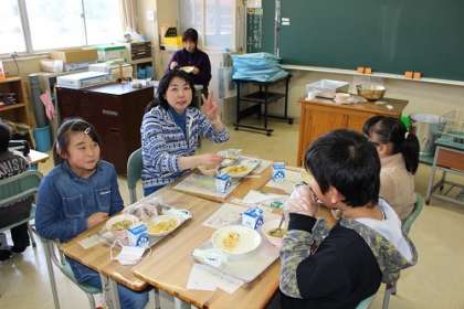 今日は、1年間読み聞かせなどでお世話になりました「まつぼっくり」と「おはなしくれよん」の方に来校いただき、子ども達と交流しながら給食を食べていただきました。