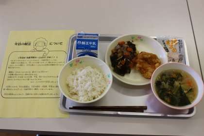 1日早いですが、今日の給食は、衛生週間にちなんで大豆や昆布、小松菜、牛乳など、歯によい食べ物がたくさん入った献立です。