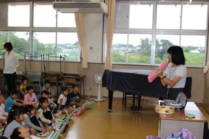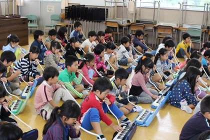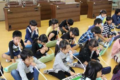 鍵盤ハーモニカの先生、阿部志津子さんが来校され、音楽室で1年生に鍵盤ハーモニカの扱い方や演奏の仕方などを指導していただきました。