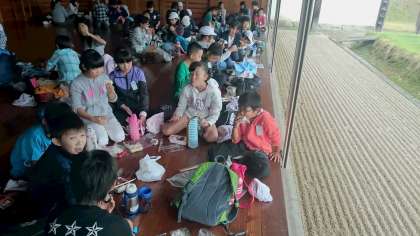 弓道場で班ごとに弁当をひろげて、お話をしながら楽しく食べました。