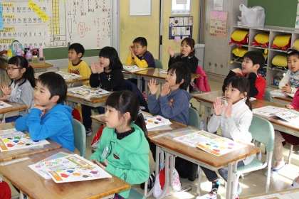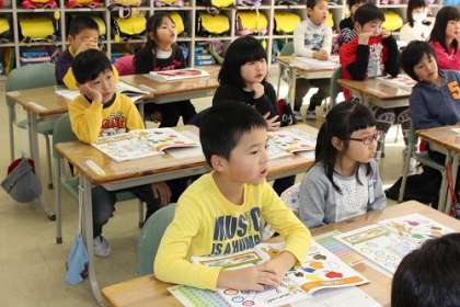 今日は、1年生3クラスと4年生1クラスでの授業です。