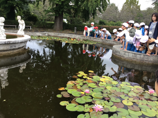 牛が牧草を食べる様子を見学したり、庭園に咲いているハスの花やメダカを見たりしました。