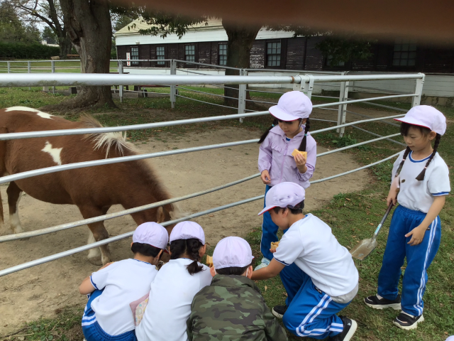 動物のえさやりでは、「かわいい~!」「毛がふさふさしているね!」と言って、