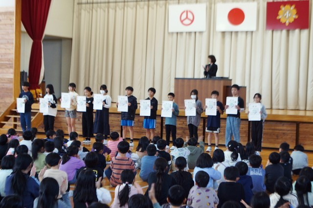 今回の集会では、「郡山市児童作文コンクール」「読書感想文福島県コンクール」「郡山市内小学校陸上競技交歓会」の表彰を行いました。