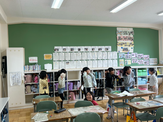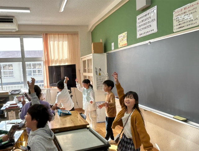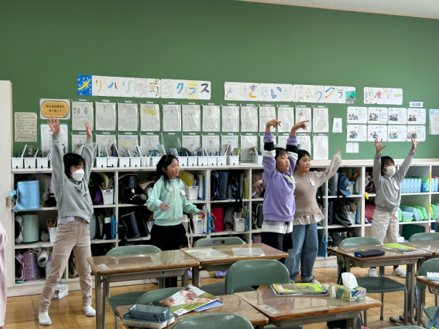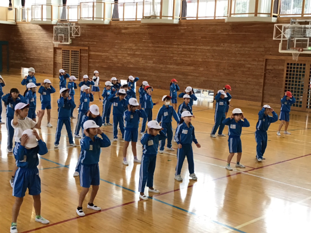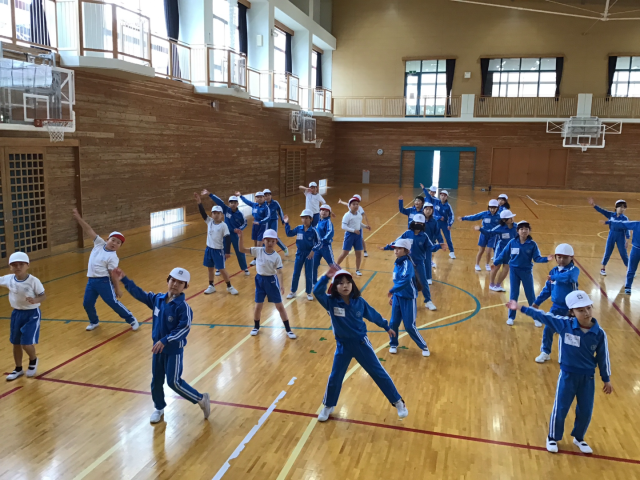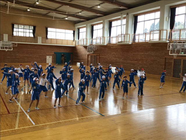 11月25日火曜日に、講師の先生を迎え、ダンス教室を行いました。体をほぐしたあと、リズムに合わせて徐々に振りを入れて踊りました。音楽に合わせてみると、教えていただいたリズムがぴったりはまっていき、次の振りを覚えていくことが楽しくなっていきました。講師の先生を「見て」覚えた後は、自分で思い出しながら音楽を「聴いて」踊ることもしました。講師の先生が見守ってくださるなか「難しい…」「どんな振りだったっけ?」など、悪戦苦闘する姿も。それでも繰り返し練習してできるようになってきたことを実感し「休み時間にも練習しよう」という声も聞こえてきました。翌日の休み時間、講師の先生の振付を見ながら一生懸命踊る姿が見られました。1月に2回目のダンス教室があるので、それまでに教えていただいたところをかっこよく踊れるように頑張っていきます。