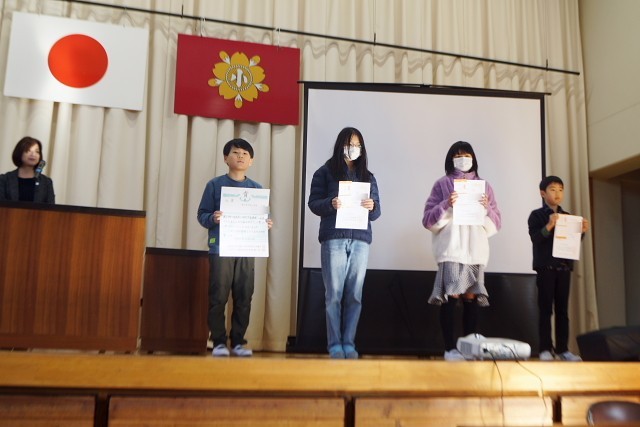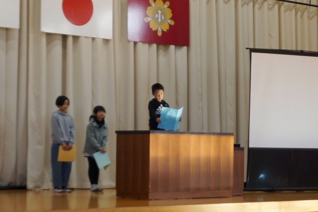 式の中で、1年生・3年生・5年生の代表児童が、「2学期の反省・冬休みのめあて」について、作文を発表しました。