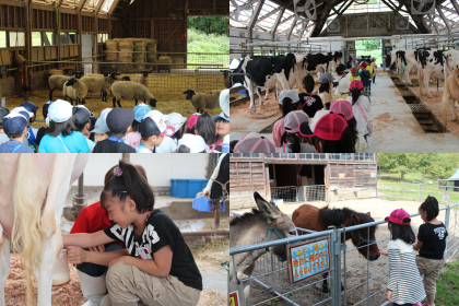 石筵牧場に着くと,メインイベントの牛の乳搾りです。テレビや本などでも見慣れている牛ですが,近くまで行くと,「大きい〜。」「目がかわいいよ。」「しっぽがふさふさだよ。」と発見がいっぱいだったようです。乳搾りをすると,「あったかいよ。」「やわらかいよ。」と牛の温かさを感じながら上手に乳搾りをすることができました。心に残る貴重な体験になったようです。