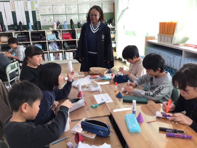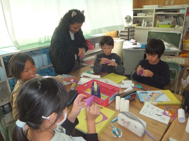 一日目はインターナショナルデーでした。もうすぐハロウィンなので、AETの先生のユニークな仮装に子ども達も大喜びでした。トイレットペーパーの芯を使って塔を作ったり、モンスターに色をぬったりと子ども達も楽しく活動に取り組みました。トイレットペーパーの芯の準備や授業参観など本当にお世話になりました。