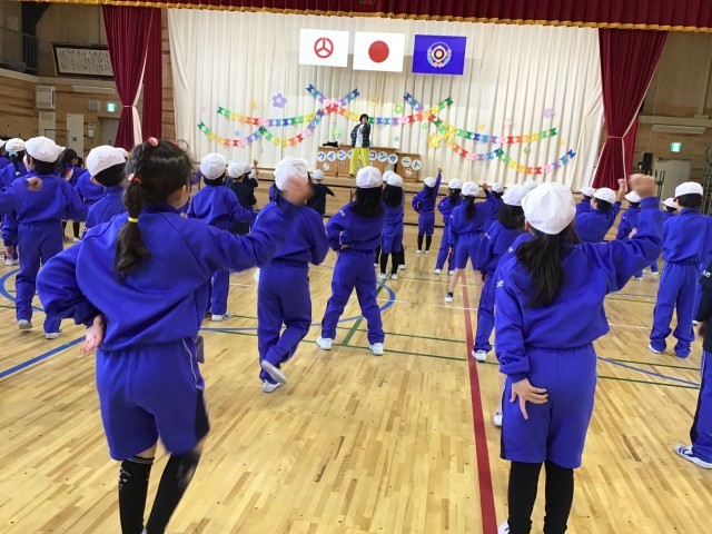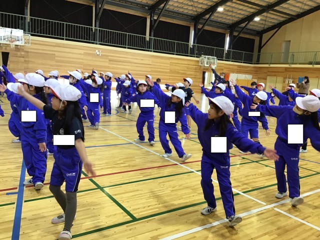 準備運動や柔軟体操をしているうちに、どんどんダンスの動きを覚えていく1年生。可愛らしい動きで、リズムに乗って楽しく踊っていました。3学期にも、引き続き練習していきます。