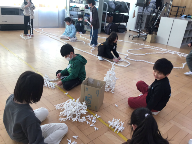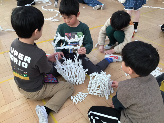図工「いっぱいつかってなにしよう」では、この日のために用意していた「3000個」の洗濯ばさみを使って、様々な表現を楽しみました。