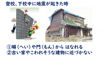お話の際に用いた資料の一部をUPします。特に,登下校時に地震が起こった場合をご覧いただき,通学路や自宅周辺の危険個所についてお子さんと確認していただけましたら幸いです。