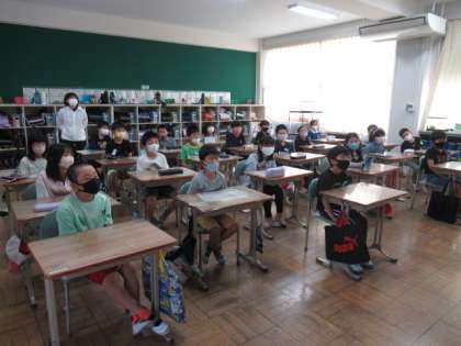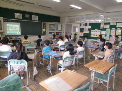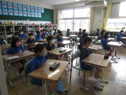 先生の話を真剣に聞き、水泳学習への意欲を高めていました。