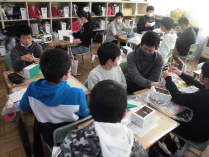くるくるクランク作製中。クランクの特性を生かした工作を始めました。一人一人工夫した作品が仕上がりそうです。協力しながら制作しています。