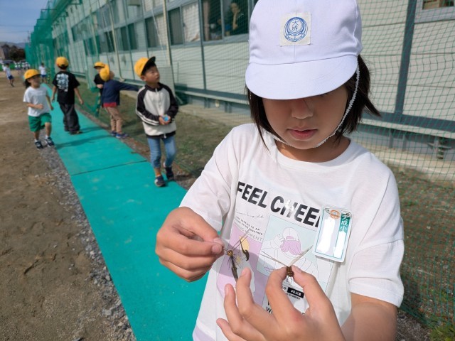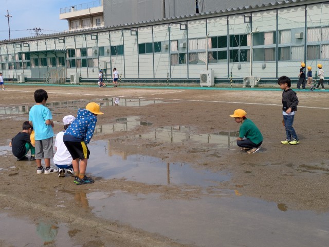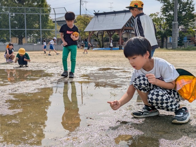 休み時間の校庭では、水たまりにきたある昆虫を採りにみんな夢中になっていました。