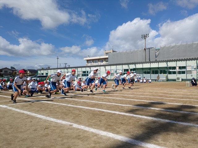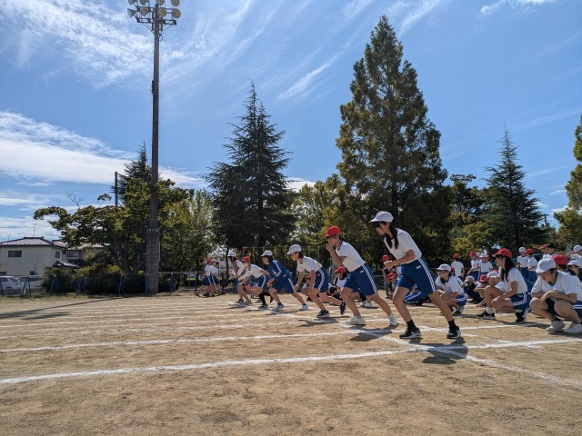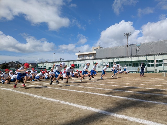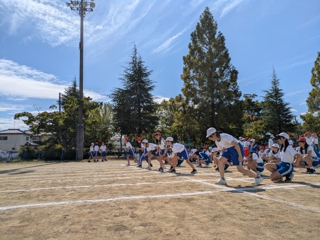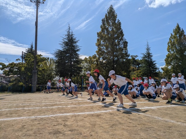 6年生が校庭でスタートの練習をしていました。みんな真剣に取り組んでいました。