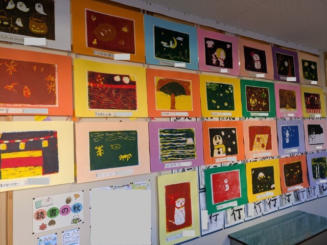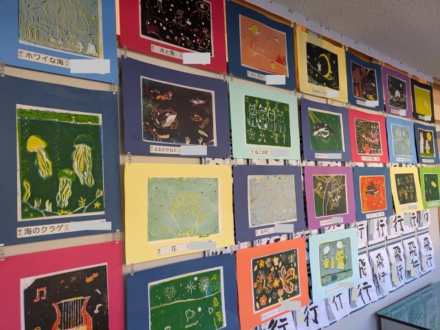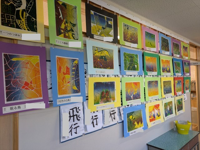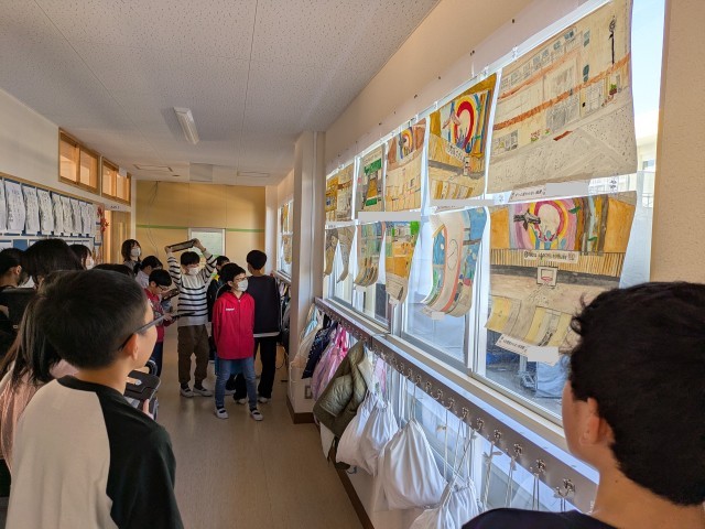 廊下では各学級で一生懸命に作った作品が並んでいます。