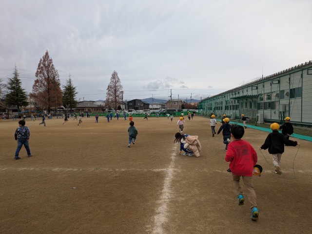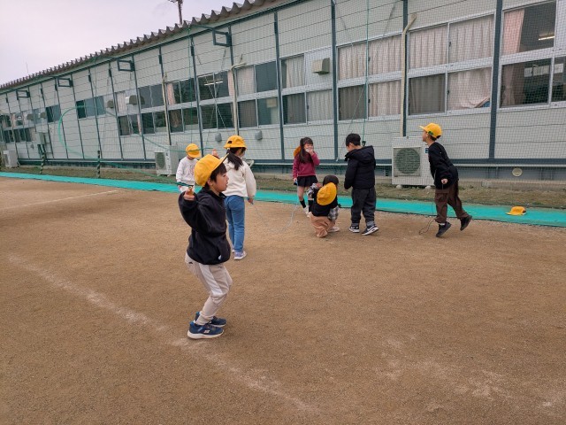 校庭でなわとびをする1年生。