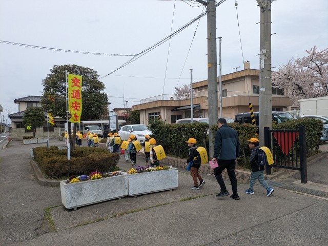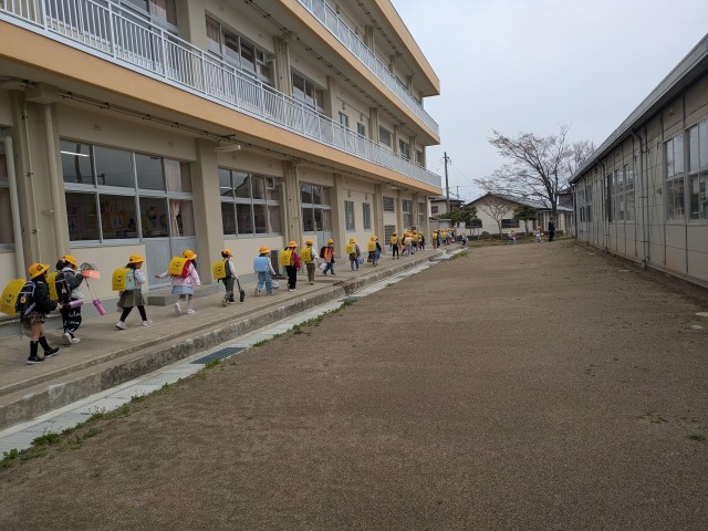 1年生は初めての下校となり、職員が手分けして指導しています。