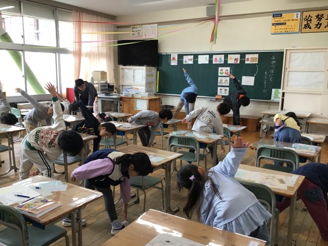 朝の時間、1年生教室に6年生がやってきて、一緒に金透体操の練習をしています。