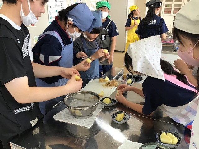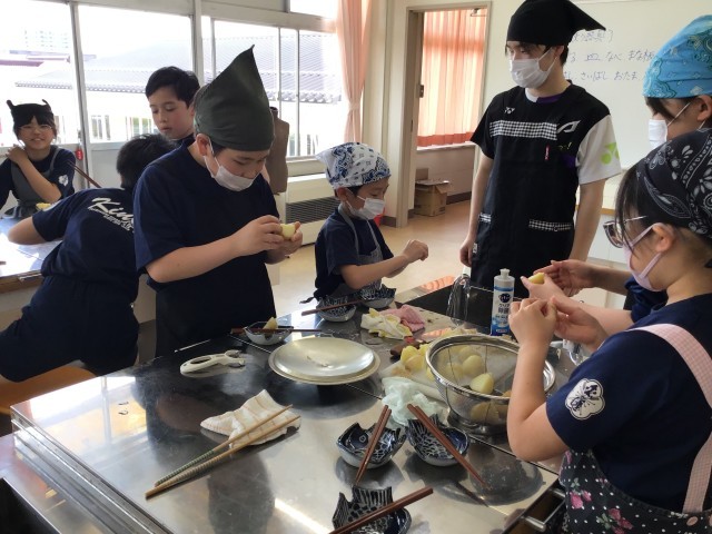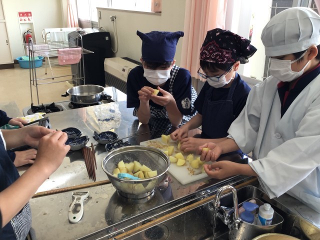 匂いにつられて行ってみると家庭科室で5年生が調理実習をしていました。