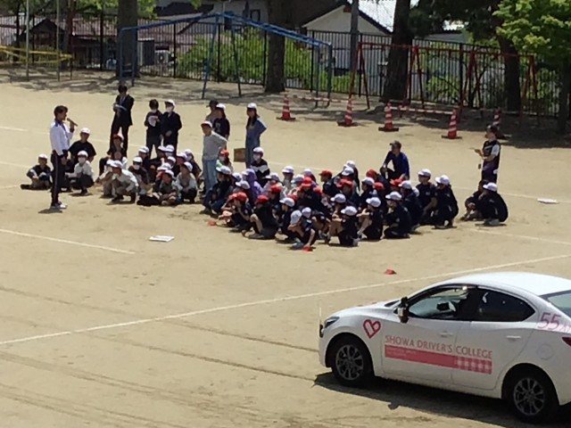 昭和ドライバーズカレッジの方を招いて、制動距離や死角について実際に見て学ぶことができました。