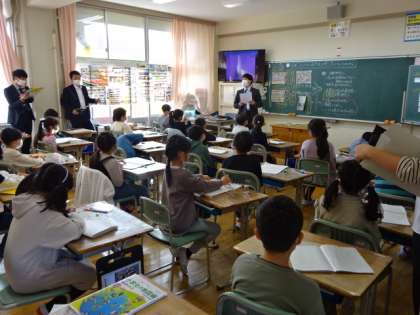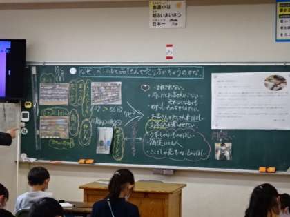 お店によって品ぞろえや並べ方が異なる意味について、店員とお客さんの双方の思いに着目して考えることで、どちらのお店もお客さんの願いに応えようと工夫していることを実感できる授業。